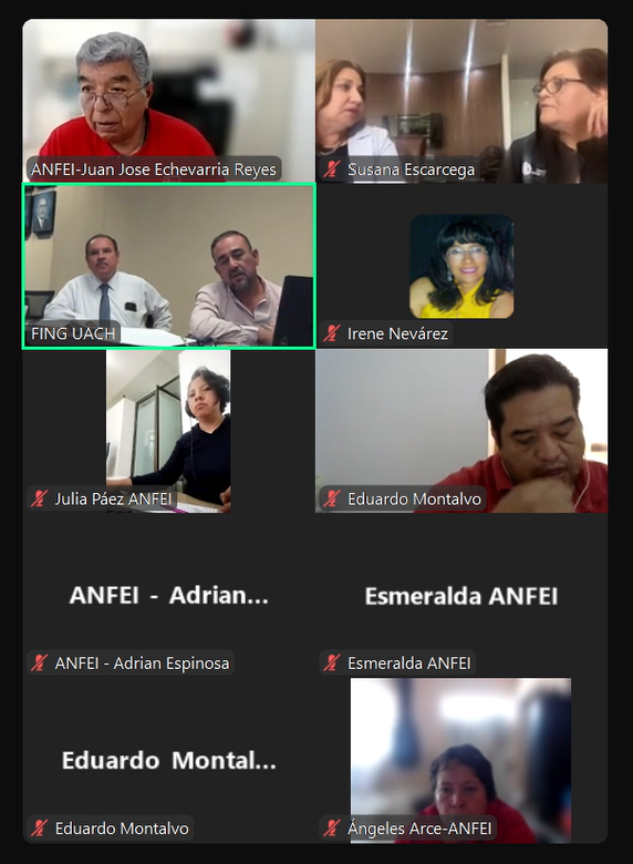 A esta reunión asistieron: el M.I. Fabián Vinicio Hernández Martínez, el M.V. Aldo Antonio Cisneros Rodríguez y el M. en I. Arión Ehécatl Juárez Menchaca por parte de la Facultad de Ingeniería de la Universidad Autónoma de Chihuahua; la Mtra. Irene Névarez Burgueño, del Instituto Tecnológico de Chihuahua; la Mtra. Susana Escárcega Castellanos y la Mtra. María Elena Martínez Castellanos, del Instituto Tecnológico de Chihuahua II; el Ing. Juan José Echevarría Reyes, secretario ejecutivo de ANFEI; la Sra. María de los Ángeles Arce González, administradora; el Sr. Eduardo Montalvo Mancilla, coordinador de Informática; el Ing. Adrián Espinosa Trinidad, desarrollador web; la Ing. Esmeralda Poceros Alvarado, asistente; y la Lic. Julia Páez López, auxiliar de Difusión.