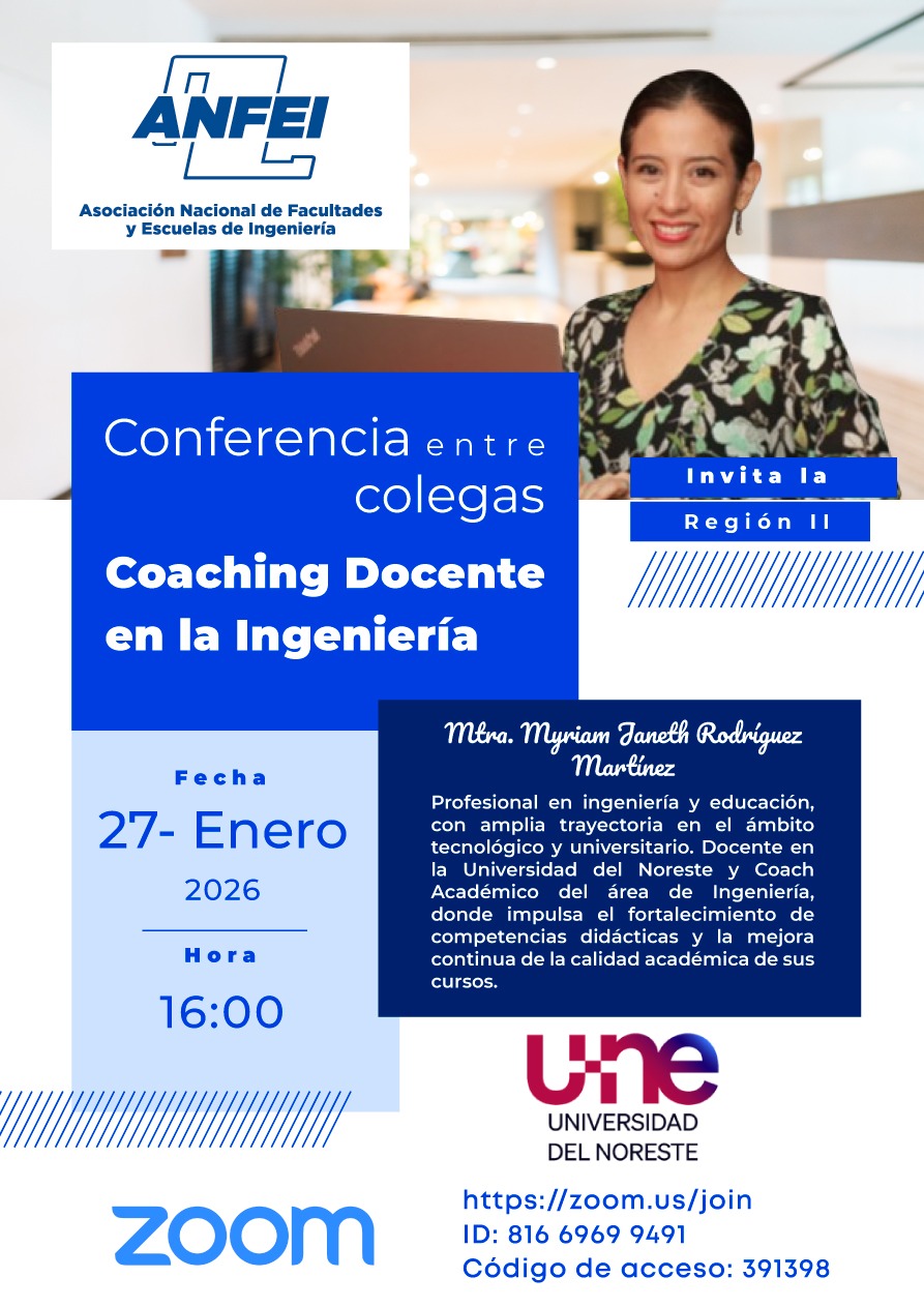 Conferencia entre Colegas: «Coaching Docente en la Ingeniería» Publicado el 16 de diciembre de 2025 por Arturo Torres Bugdud en Región II La Región II de la ANFEI los invita a la Conferencia entre Colegas: «Coaching Docente en la Ingeniería», imparte la Mtra. Myriam Judith Rodríguez Martínez. Docente de la Universidad del Noreste y profesional de la ingeniería.