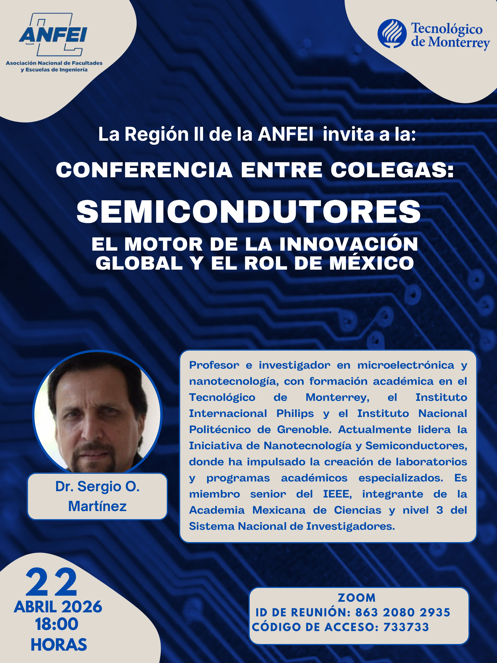 La Región II de la ANFEI los invita a participar en la Conferencia entre Colegas: «Semiconductores – El Motor de la Innovación Global y el Rol de México», impartida por el Dr. Sergio O. Martínez.